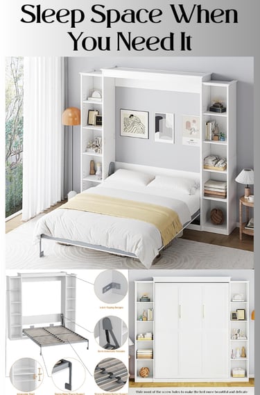 The queen Murphy bed cabinet from Rophefx folds neatly into a stylish cabinet, making it perfect for guest rooms, home offices, or multi-purpose spaces where every square foot matters. It transforms any room into a comfortable guest space in seconds. When not in use, it looks like a sleek cabinet. Featuring two 5-tier adjustable storage shelves, this Murphy bed offers space for books, clothes, décor, and essentials. Adjustable partitions make it easy to customize storage for your needs. This queen Murphy bed is ideal for rooms that need to do double duty. Fold it away to create space for work, workouts, or hobbies—then pull it down when it’s time to sleep.