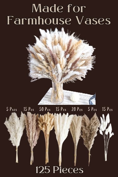 This dried pampas grass bouquet from Bannifll includes 125 pieces of bunny tails, pampas grass, and reeds in soft neutral tones. Perfect for ceramic vases, shelves, tables, and entryways, it adds texture and warmth without overwhelming your space. Featuring seven varieties of dried florals, this pampas grass set creates a full, layered boho look. Style it in modern farmhouse or boho spaces to add softness, movement, and natural texture to your decor. Designed to fit most boho and farmhouse-style vases, these dried florals are ideal for small to medium arrangements. Pair them with ceramic vases, mantel decor, or shelf styling for a cohesive, styled look.