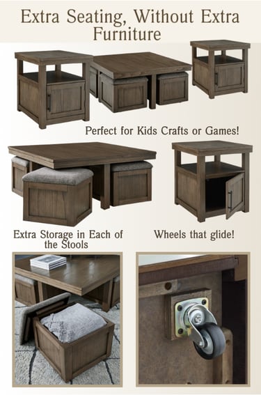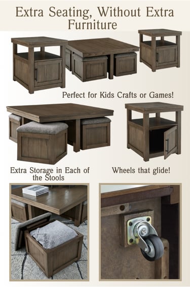 The Boardernest coffee table set by Ashley Furniture instantly upgrades your living room. Featuring a coffee table with four cushioned storage stools that roll out on casters, plus matching end tables with storage, it’s a smart solution for entertaining, movie nights, and everyday family living. It would also work well for smaller living rooms and multipurpose family spaces.