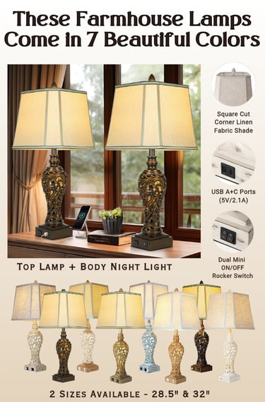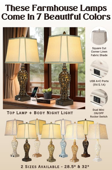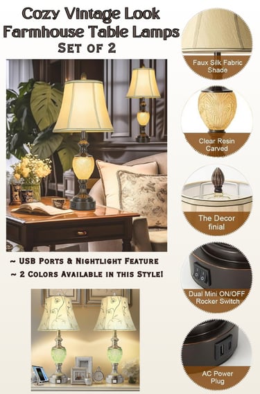 This 27” vintage farmhouse table lamp set adds warmth and charm to bedrooms, guest rooms, and living spaces. Featuring soft faux silk bell shades and a timeless farmhouse design, these lamps create a cozy, welcoming glow that works beautifully in everyday living. Designed for real-life bedrooms, these bedside lamps feature built-in USB ports for charging devices and a separate nightlight function for soft nighttime glow. Independent switches let you control the main light and nightlight separately