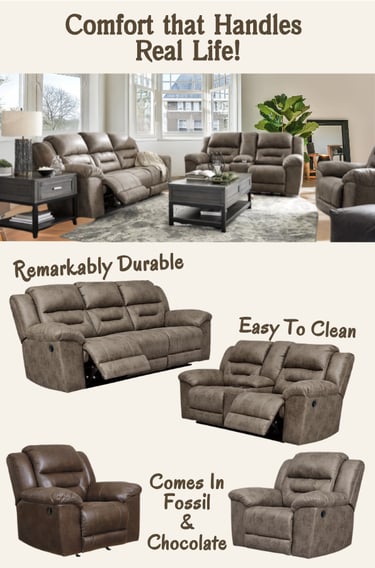 The Stoneland Collection by Ashley Furniture blends the cool look of leather with the warm comfort of fabric. Featuring a reclining sofa, reclining loveseat with console, and a rocker recliner, this collection is designed for family spaces that need comfort, durability, and style. Available in Fossil or Chocolate. The Stoneland reclining sofa features dual-sided recliners, supportive channel-stitched back cushions, and high-quality foam seating for indulgent comfort. The reclining loveseat includes a center console with storage and two cup holders. The Stoneland Rocker Recliner offers a gentle rocking motion and easy pull-tab reclining. Perfect for movie nights and everyday lounging, this collection offers style and relaxation in one family-friendly design.