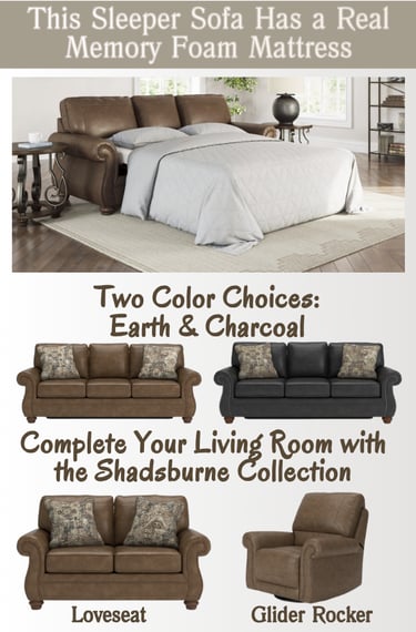 The Shadsburne queen sleeper sofa blends timeless design with everyday durability. Nailhead trim accents, classic roll arms, and decorative turned legs with a faux wood finish give this piece a polished look that elevates any living room. Everyone can enjoy a great night’s rest with a pull-out queen memory foam mattress, this sleeper sofa offers everyday comfort and a cozy sleep solution for overnight guests. Available in Earthtone or Granite to suit your living room style. The Shadsburne Collection makes it easy to design a coordinated living room. Pair the queen sleeper sofa with the matching sofa, loveseat, and glider rocker.