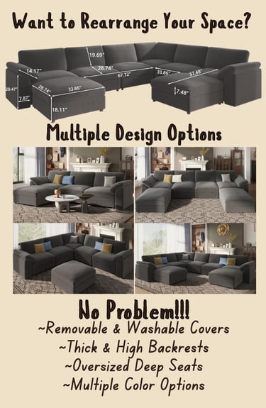 The EASE MOOSE modular sectional is designed for next-level comfort with oversized seats, extra-deep cushions, and a taller backrest that better supports your neck and back. With wide, spacious seating and a cloud-like feel, it’s perfect for relaxing, lounging, and everyday family living. It is designed with a busy families in mind, this modular sectional features removable, washable seat cushions, back pillows, and armrest covers. It can be rearranged to fit your space L-Shaped, U-shaped, Left or Right. It does a great job of conforming to your space! It comes in 3 seats all the way up to 9 sets and 5 different color options. Just take a look and see for yourself!